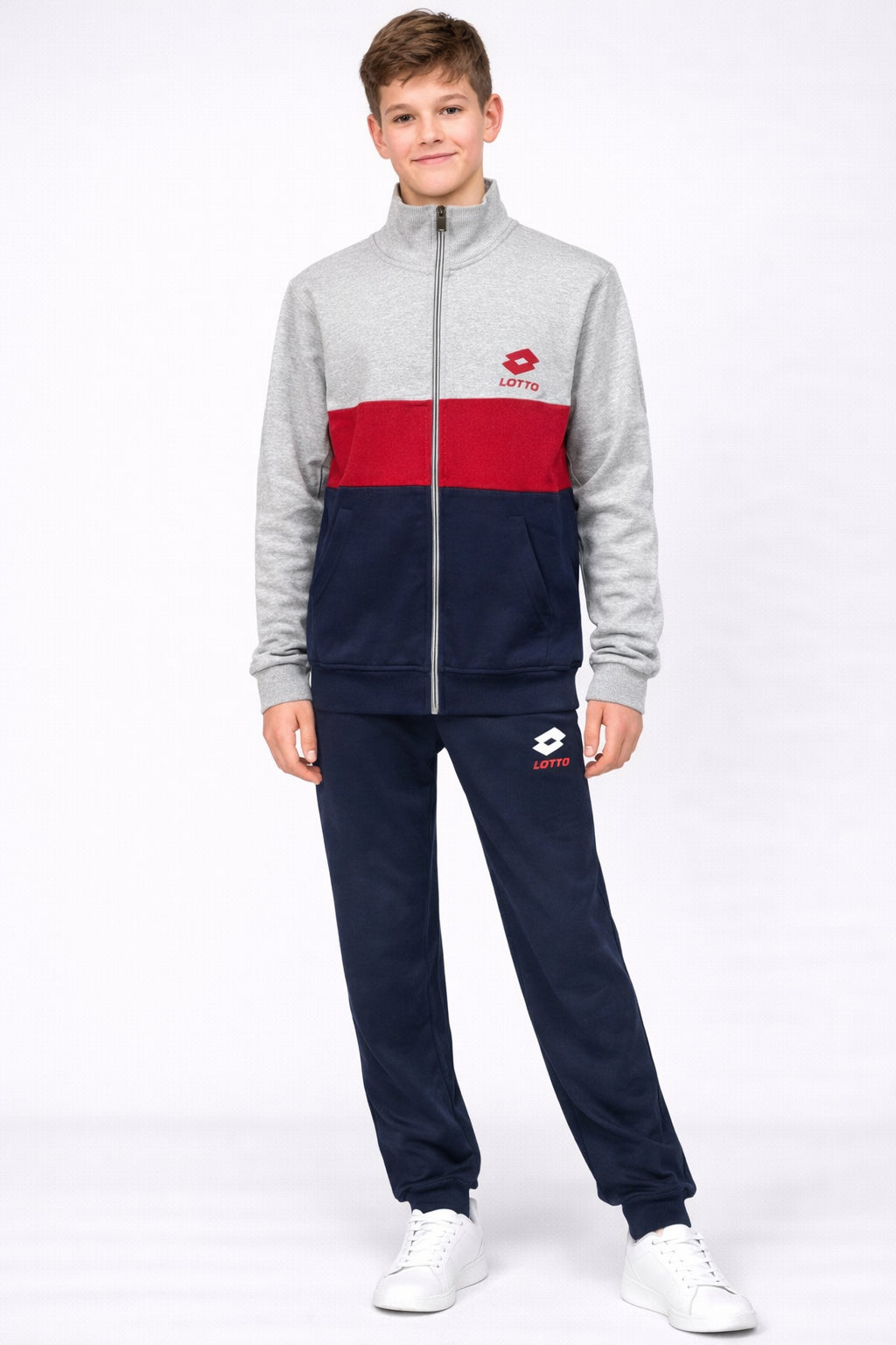 Il completo è composto da felpa con zip frontale e pantalone coordinato, realizzati in tessuto morbido e confortevole che garantisce calore e libertà di movimento. Il design sportivo, arricchito dal logo Lotto, offre un look dinamico e moderno, perfetto per l’uso quotidiano.