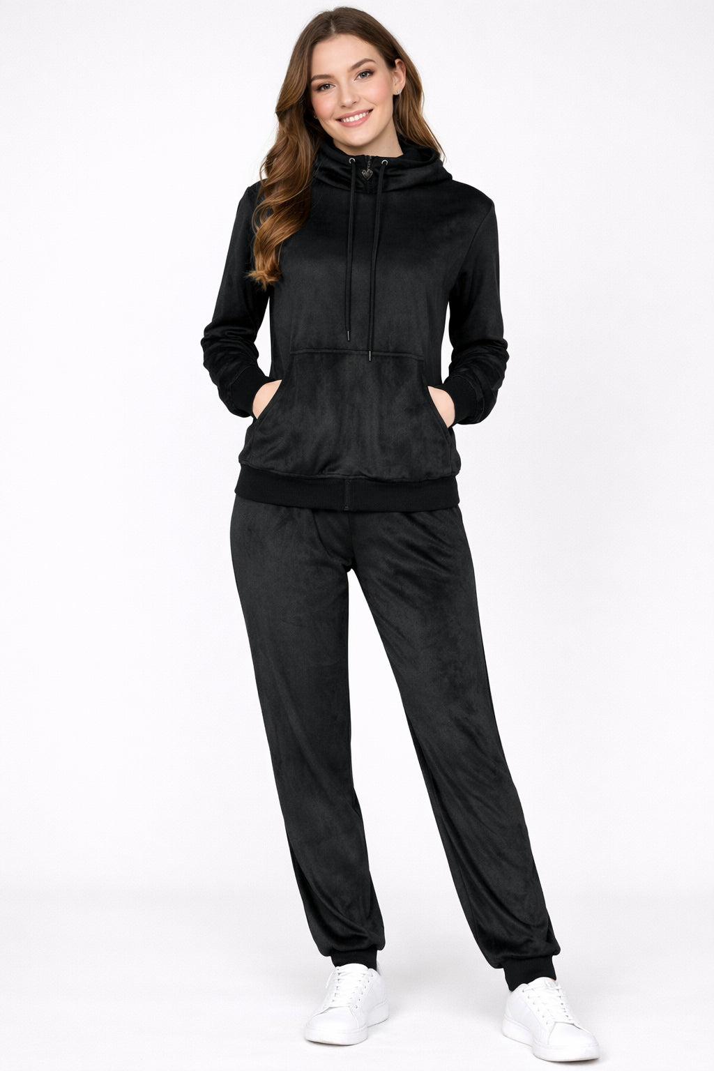 Il completo è composto da felpa con cappuccio e laccetti regolabili abbinata a pantalone coordinato, realizzati in tessuto vellutato al tatto, caldo e piacevole sulla pelle. La vestibilità regolare valorizza la figura garantendo libertà di movimento, rendendola ideale per casa, tempo libero o momenti di relax.