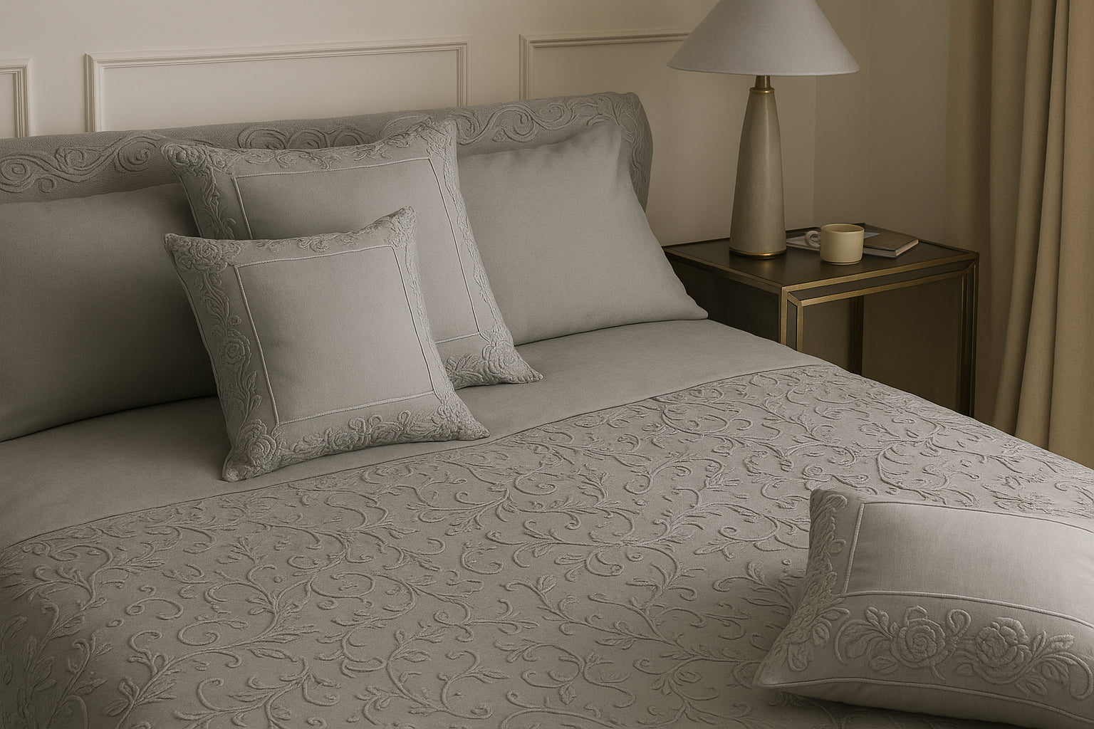 Questa collezione, realizzata interamente in cotone tinto in capo, offre una mano morbida e piacevole al tatto, sinonimo di comfort e qualità superiore. La trapuntatura e il ricamo 3D all-over con effetto a rilievo creano un gioco di texture raffinato e armonioso, rendendo ogni trapunta un pezzo unico e ricercato.