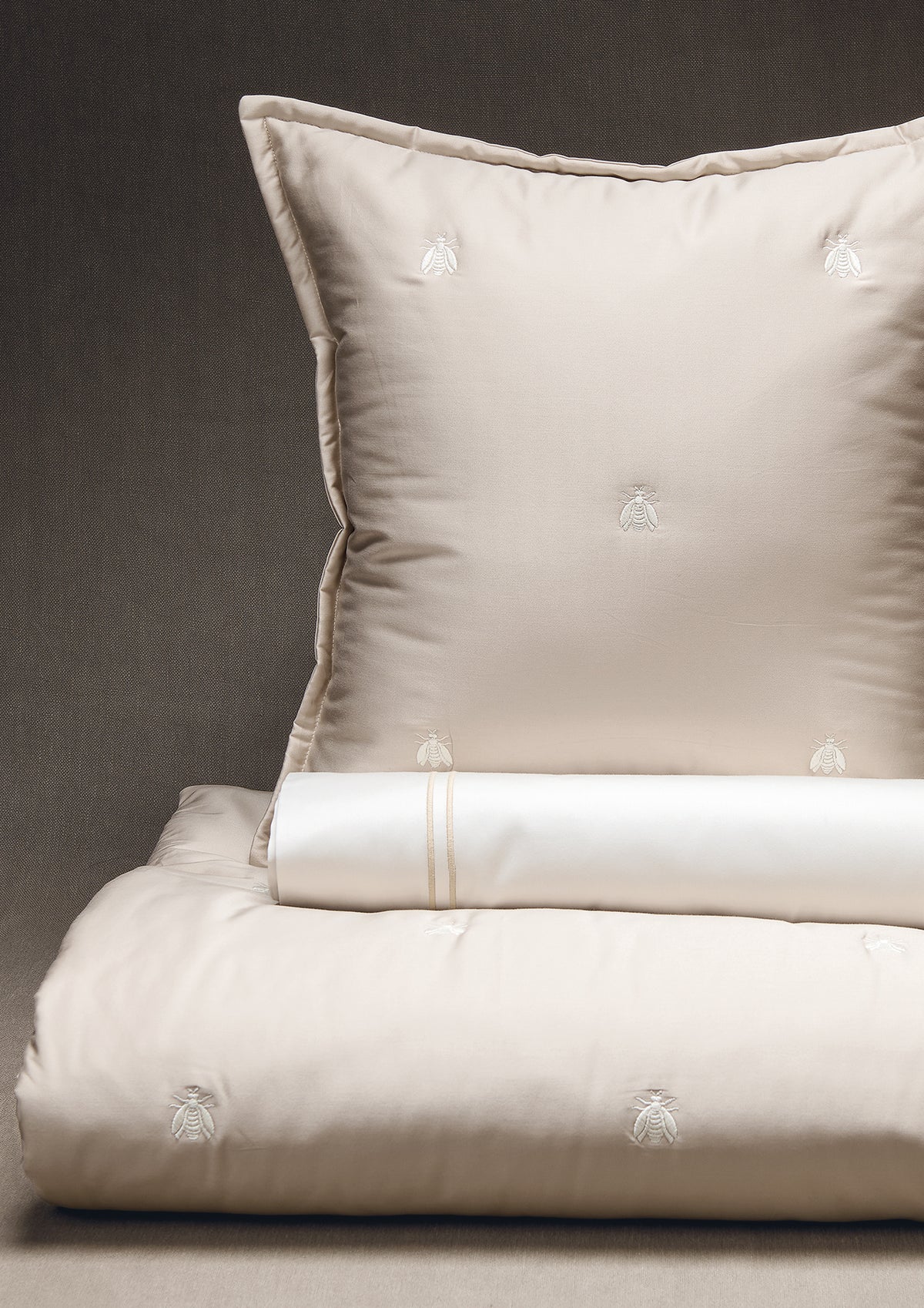 La trapuntatura a punti esalta la lavorazione sartoriale e mantiene uniformemente l’imbottitura da 350 gr/mq, garantendo un calore avvolgente e costante durante tutta la notte. Le delicate decorazioni a tema Api, finemente ricamate, donano un tocco sofisticato e naturale che impreziosisce qualsiasi ambiente, dal classico al contemporaneo.