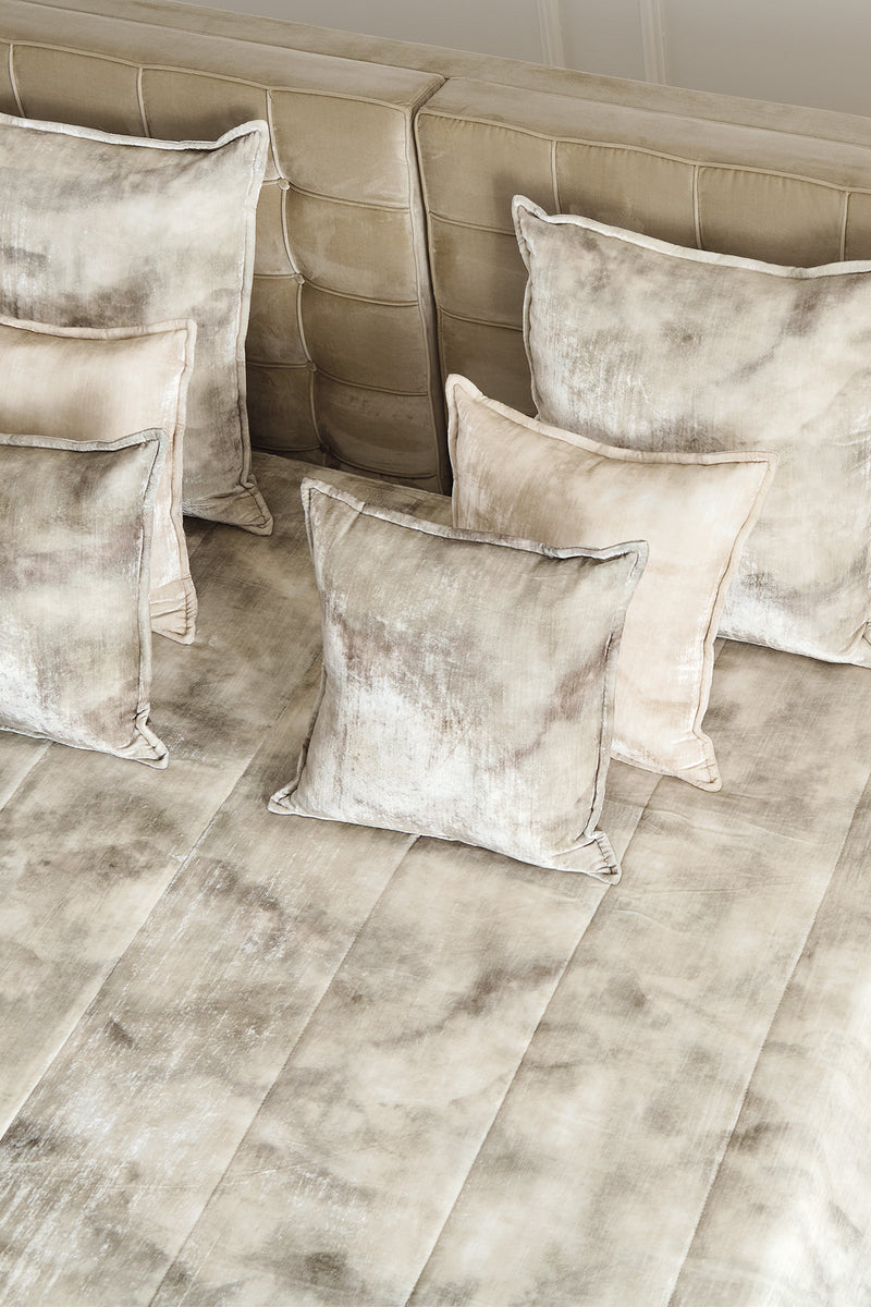 Realizzata in un pregiato velluto composto da 82% viscosa e 18% seta, questa trapunta si distingue per la sua colorazione disomogenea ispirata alla tecnica “tie and dye”, che conferisce al tessuto un effetto cromatico unico, ricco di sfumature e riflessi cangianti. Ogni pezzo è leggermente diverso, rendendo ogni trapunta un esemplare esclusivo e irripetibile.