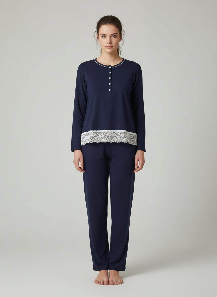 Il top presenta un fondo impreziosito da pizzo delicato, aggiungendo un tocco di femminilità e stile, mentre lo scollo con bottoni unisce praticità e raffinatezza. Con il suo design essenziale e sofisticato, è pensato per chi desidera sentirsi a proprio agio senza rinunciare all’eleganza anche a casa.