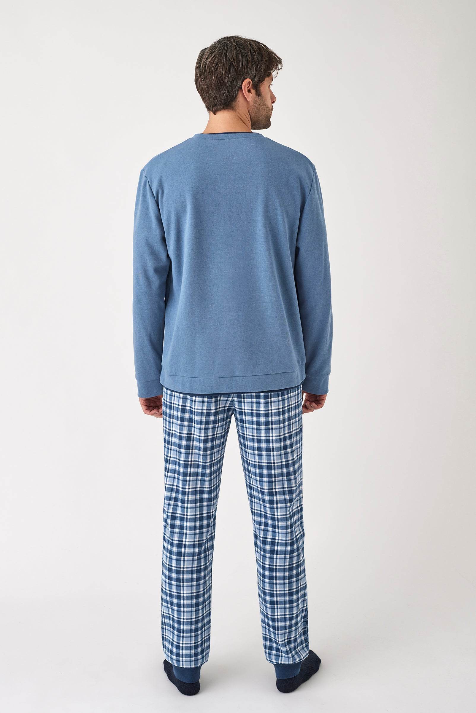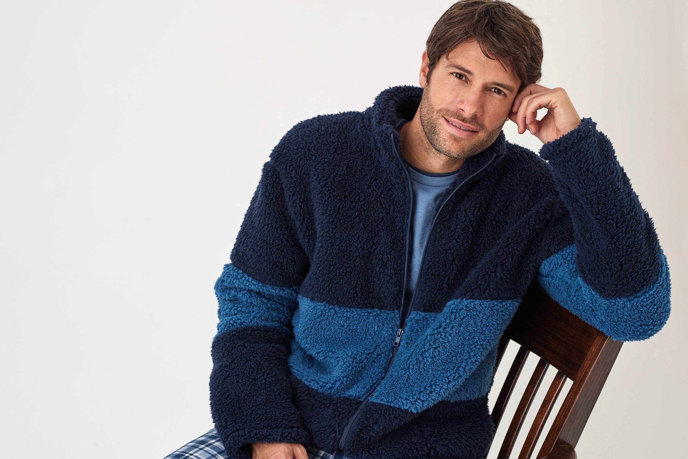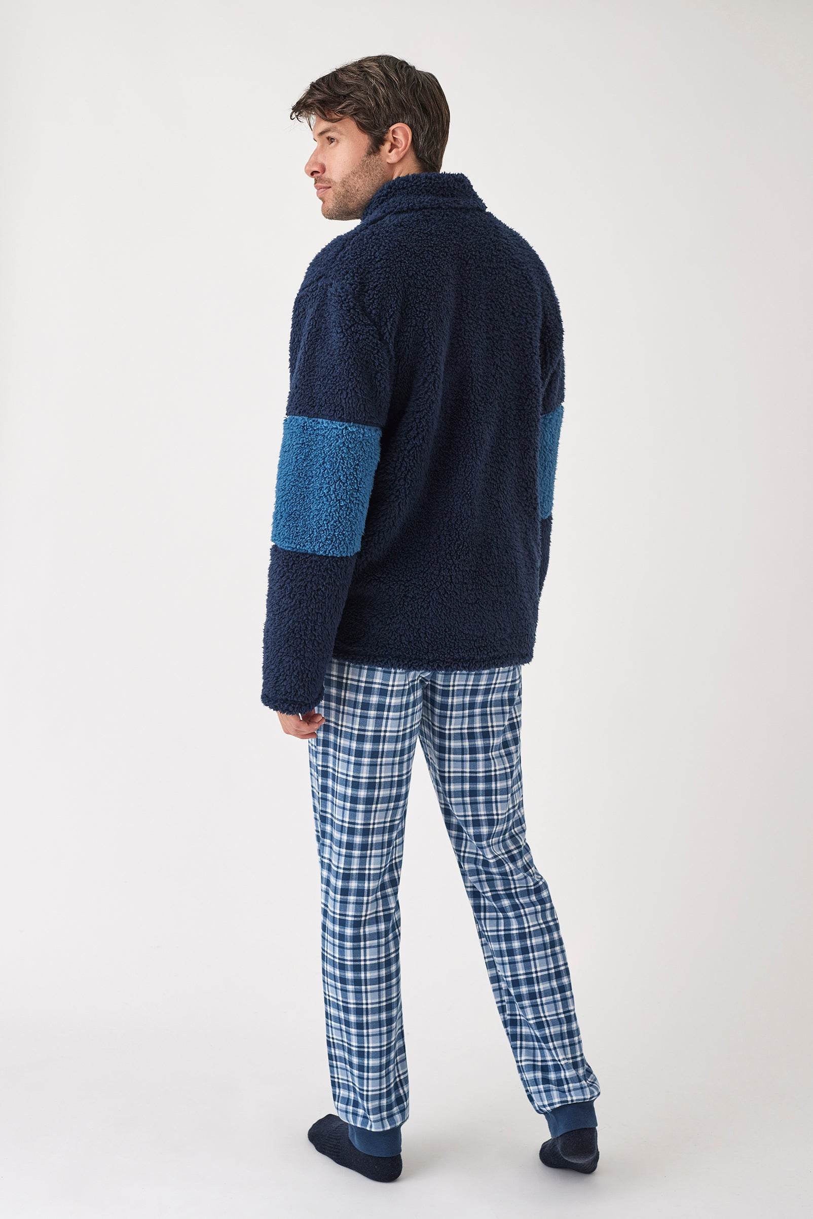 Comodo e caldo completo da uomo composto da pantalone lungo con polsini, maglia a maniche lunghe in interlock con perchado interno e giacca in tessuto coral (borreguito) con chiusura a zip. Ideale per il relax a casa o le serate più fresche.