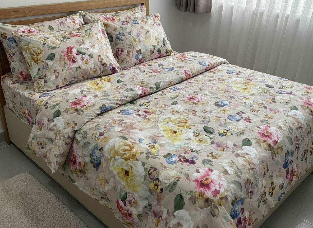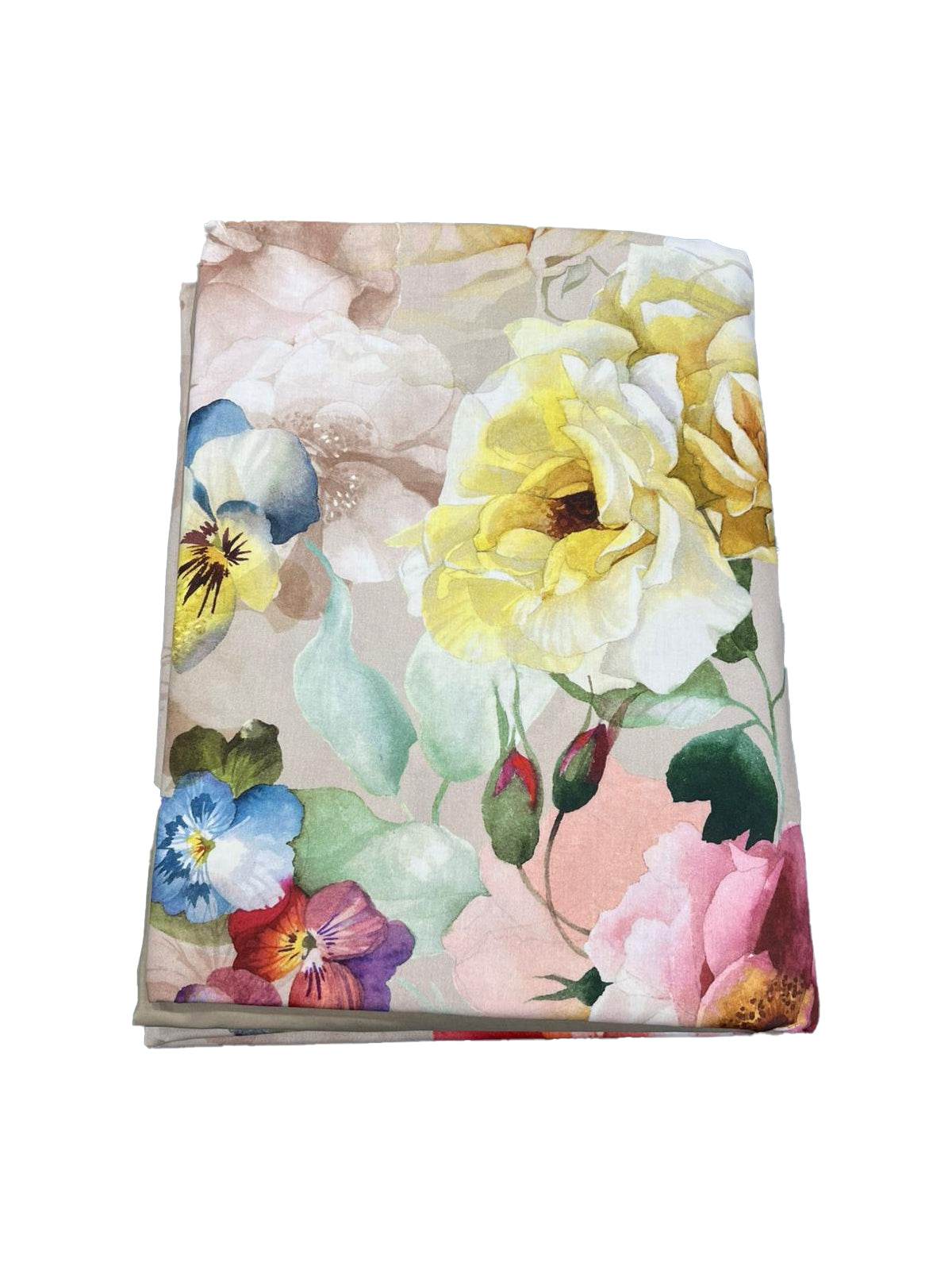 Realizzato in morbido e pregiato percalle di cotone, questo set offre una piacevole sensazione di leggerezza e freschezza al tatto, garantendo un riposo confortevole in ogni stagione. La fantasia floreale delicata e romantica si adagia su un fondo bianco o beige, esaltando la luminosità e l’armonia dei colori.