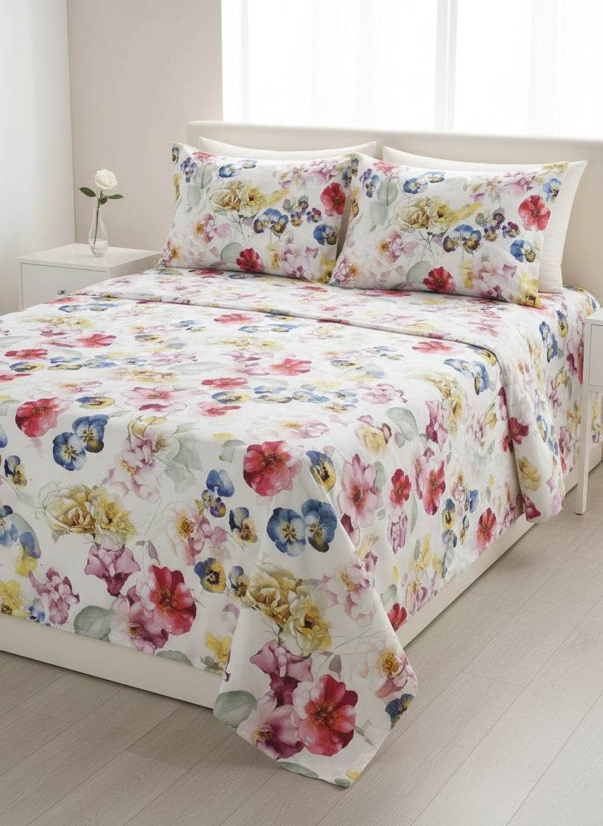 🌸 Completo Lenzuola Matrimoniale Mirabello “Bloom Cascade” in Percalle di Cotone – Fantasia Floreale su Fondo Bianco o Beige, nei Toni dell’Azzurro e del Rosa