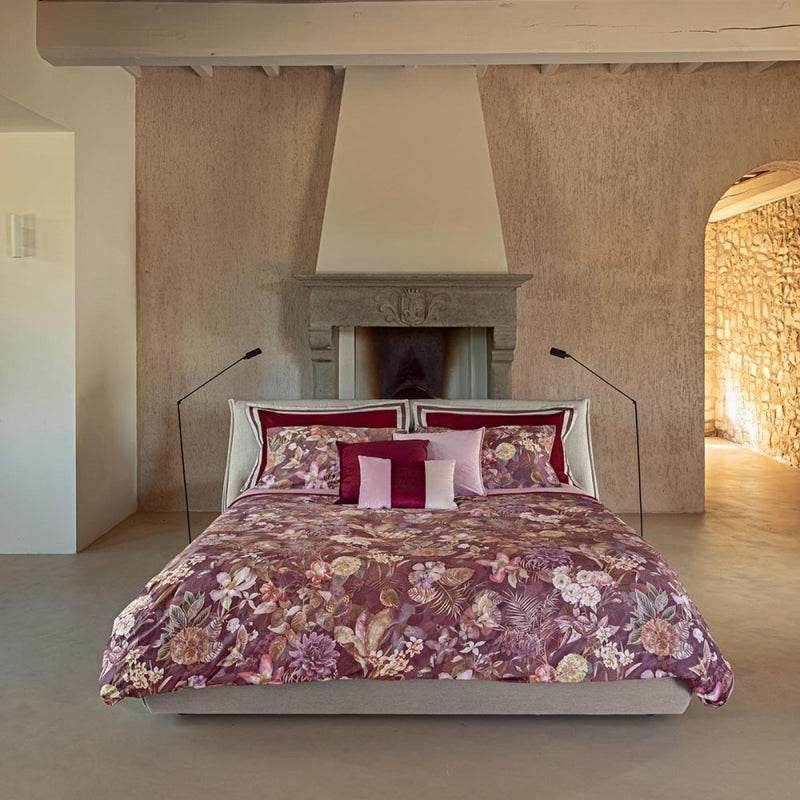 Il design, dal sofisticato effetto tappezzeria, si distingue per una palette cromatica armoniosa e ricercata: verde, burgundy con rosa arredo e neutri delicati, perfetti per trasformare la camera da letto in un ambiente elegante e accogliente.
