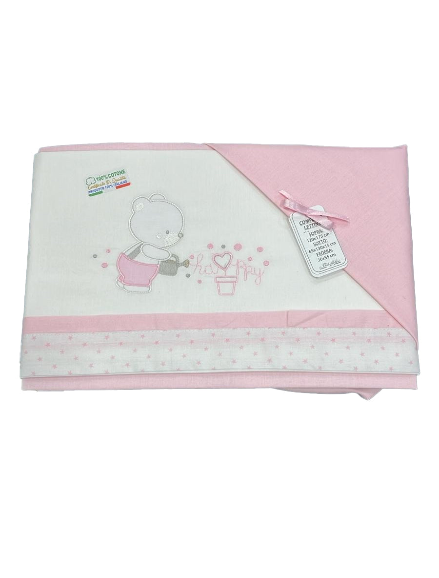 Delicato completo per culla lettino, pensato per garantire comfort e morbidezza durante il riposo del neonato. La fantasia con orsacchiotti che annaffiano romanticamente una piantina, nei dolci toni bianco e rosa, crea un’atmosfera tenera e raffinata, ideale per la cameretta dei più piccoli.