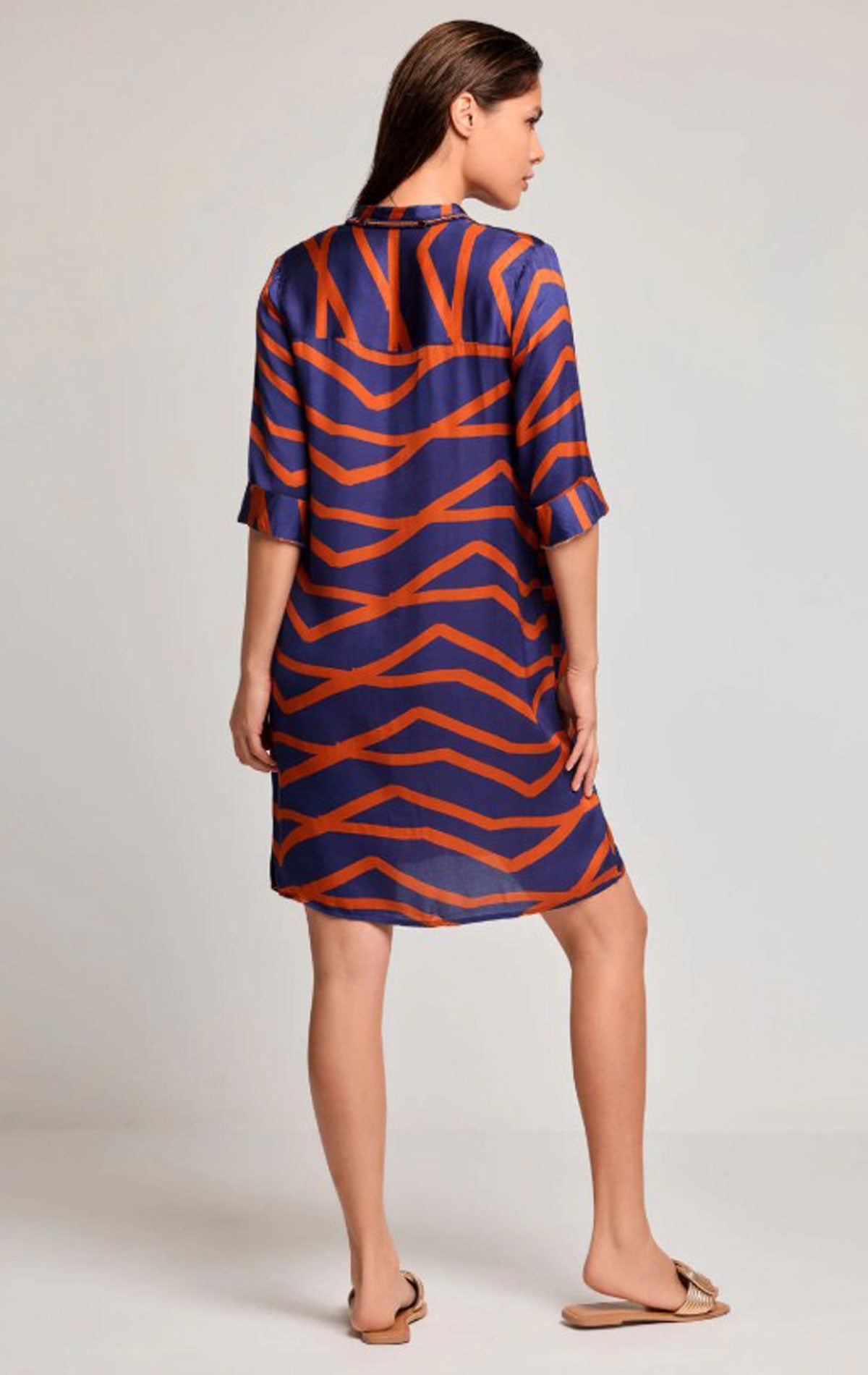 La stampa geometrica a contrasto nei toni del blu e arancio dona personalità al capo, mentre il taglio ampio con abbottonatura frontale permette di regolare la vestibilità e lo stile, indossandolo sia chiuso come abito sia aperto sopra il costume.