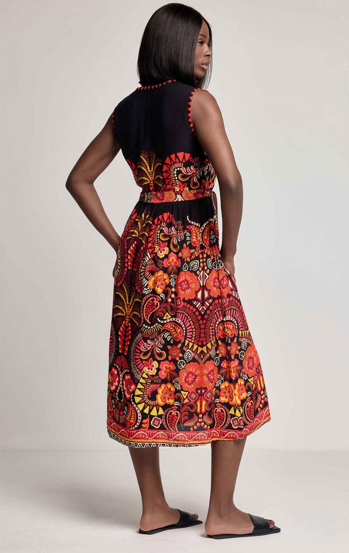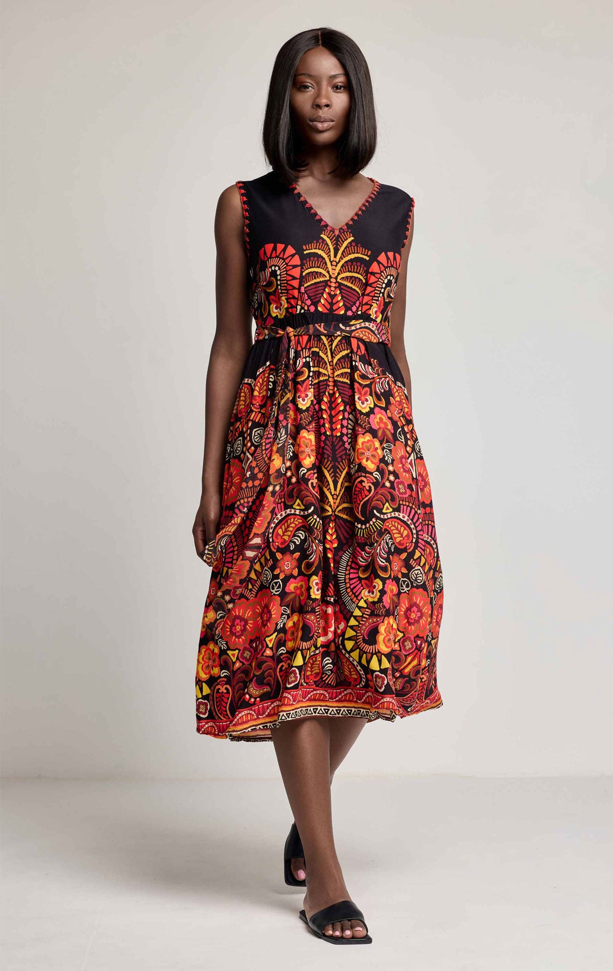 L’abito Kyoko in viscosa è la scelta ideale per un look estivo raffinato in stile etno-chic. Realizzato in 100% viscosa, è leggero, fresco e piacevole sulla pelle, perfetto per le giornate più calde. La stampa Neo Folk dai toni vivaci dona carattere e originalità, mentre lo scollo a V e la vita leggermente arricciata valorizzano la silhouette con naturale eleganza.