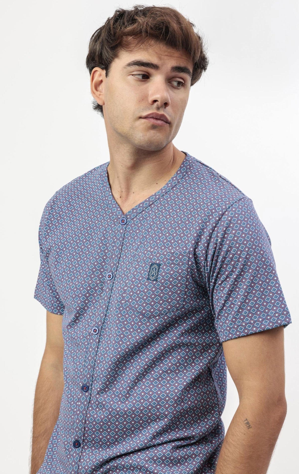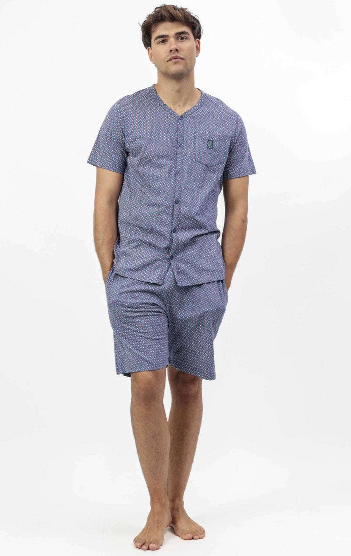 Pigiama uomo Admas Classic Sterling in 100% cotone, leggero e traspirante, ideale per la stagione estiva. Composto da maglia a maniche corte aperta sul davanti con girocollo e taschino con logo, abbinata a pantaloncini con tasche laterali e vita elasticizzata regolabile. Morbido e confortevole, garantisce libertà di movimento e praticità per il relax quotidiano.