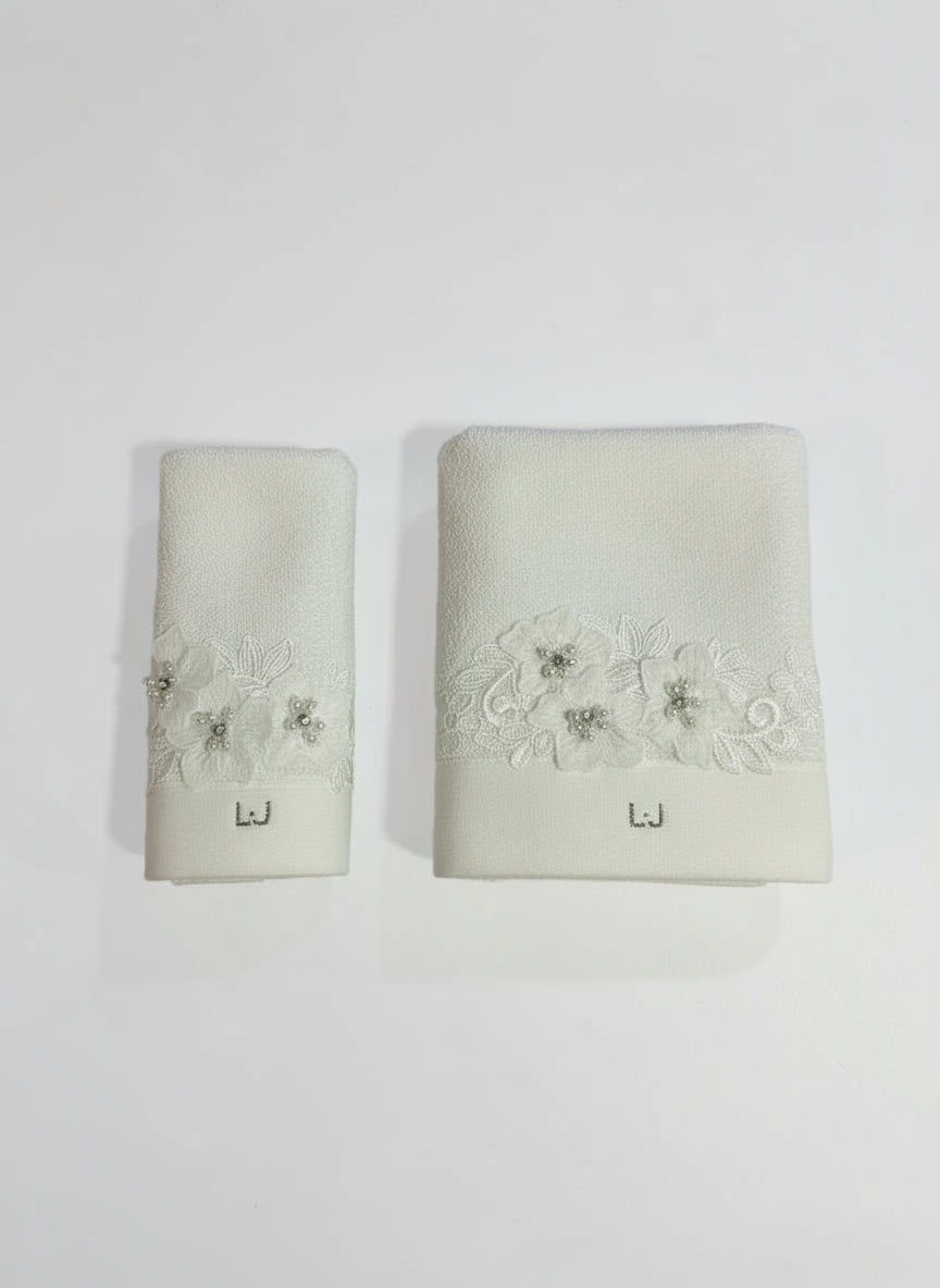 Realizzati in morbida spugna di cotone, assicurano un’ottima capacità di assorbimento e una sensazione di comfort sulla pelle. Le decorazioni in pizzo e i cristalli Swarovski applicati a mano impreziosiscono il set, rendendolo un autentico dettaglio di classe.