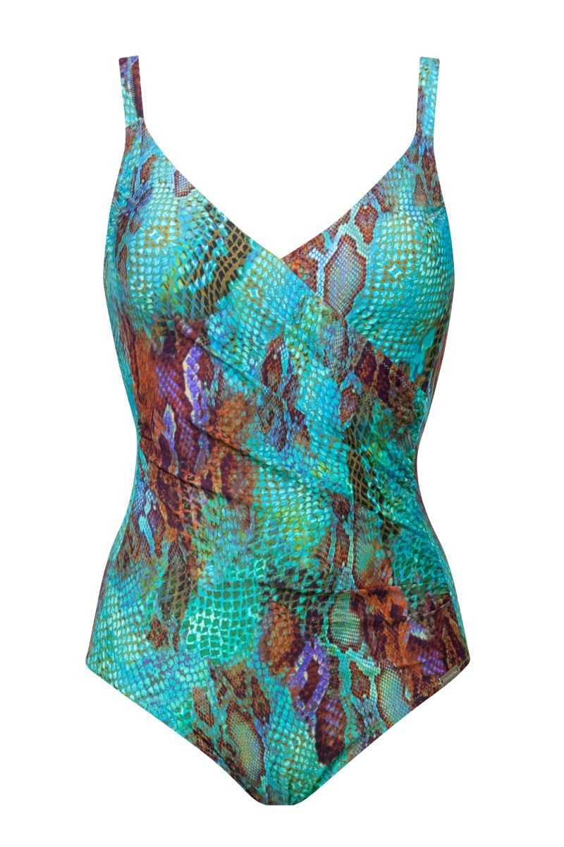 Costume da bagno intero modellante, pensato per valorizzare la silhouette offrendo comfort e sostegno naturale. Il design con scollo a V e arricciature strategiche su coppe e punto vita aiuta a snellire visivamente la figura, mentre la fodera addominale garantisce un delicato effetto contenitivo.