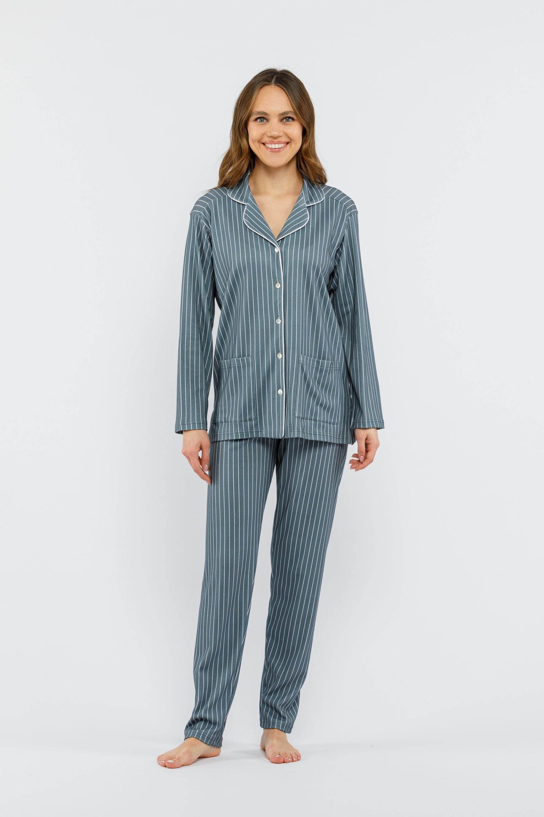 La maglia con apertura frontale a bottoni presenta una fantasia a righe, abbinata al pantalone lungo coordinato per un look armonioso. Il collo elegante dona un tocco raffinato al capo, rendendolo adatto sia al relax quotidiano che come idea regalo.