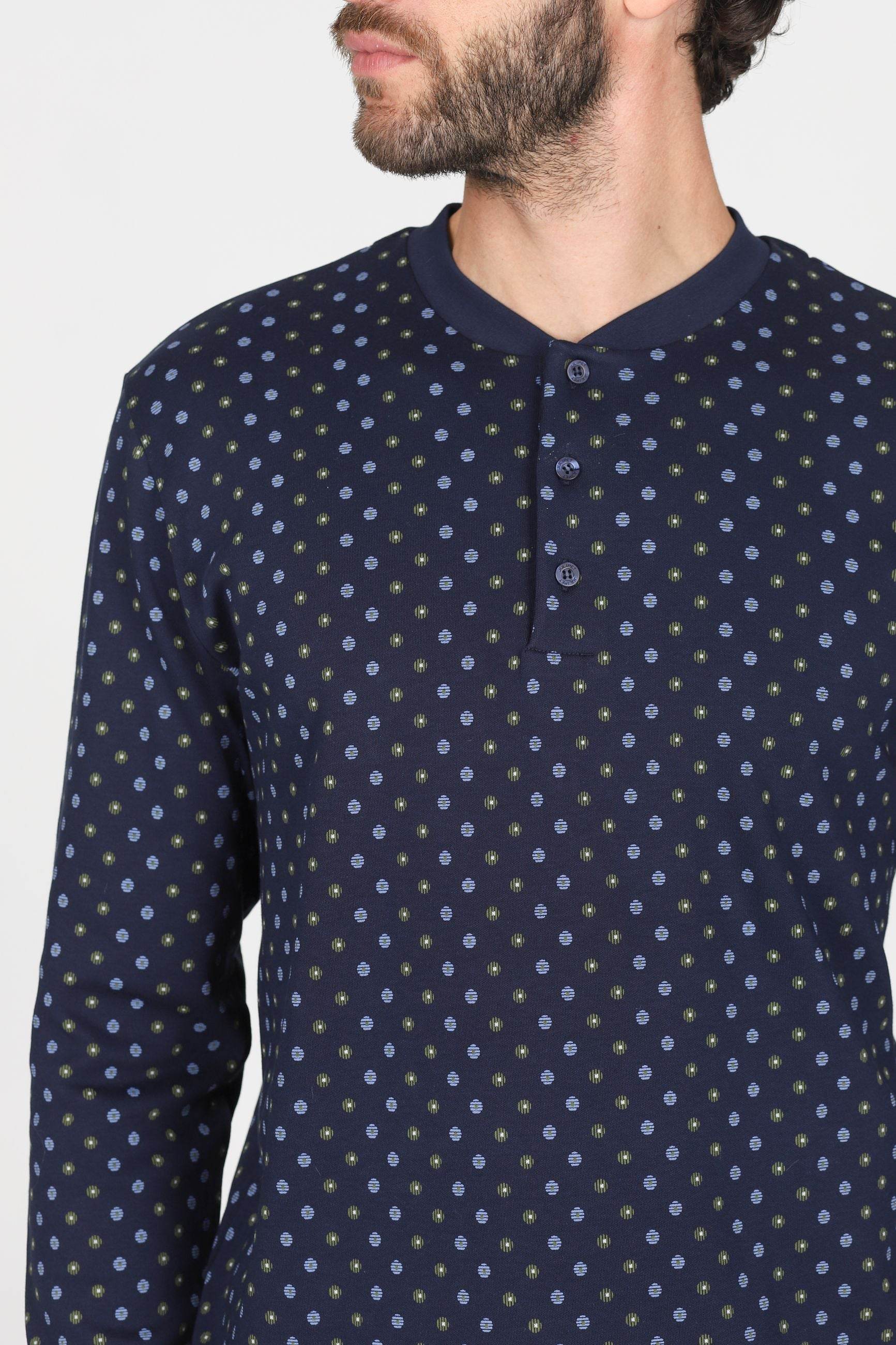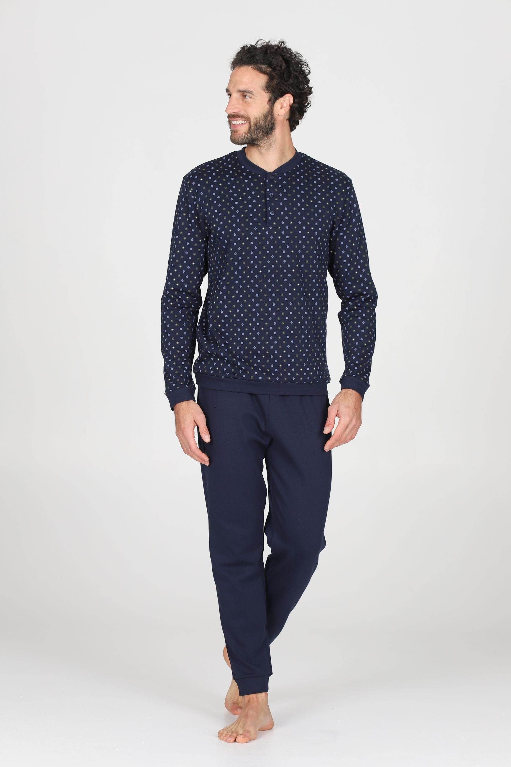 Eleganza e comfort si incontrano nel pigiama Nettuno Serafino, realizzato in 100% cotone interlock, morbido, caldo e traspirante. La maglia presenta uno scollatura serafino con bottoni, mentre il pantalone lungo assicura vestibilità comoda e naturale.