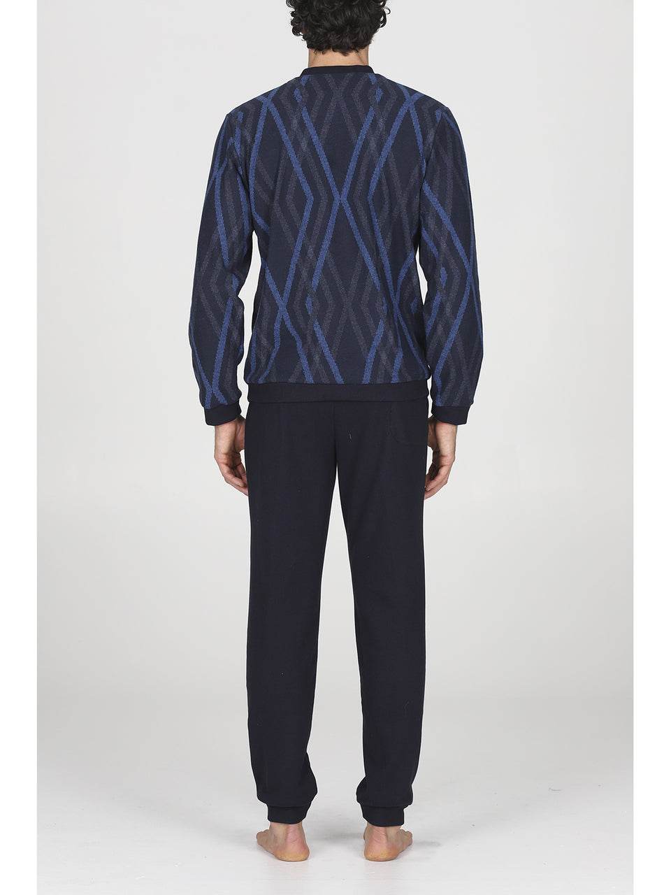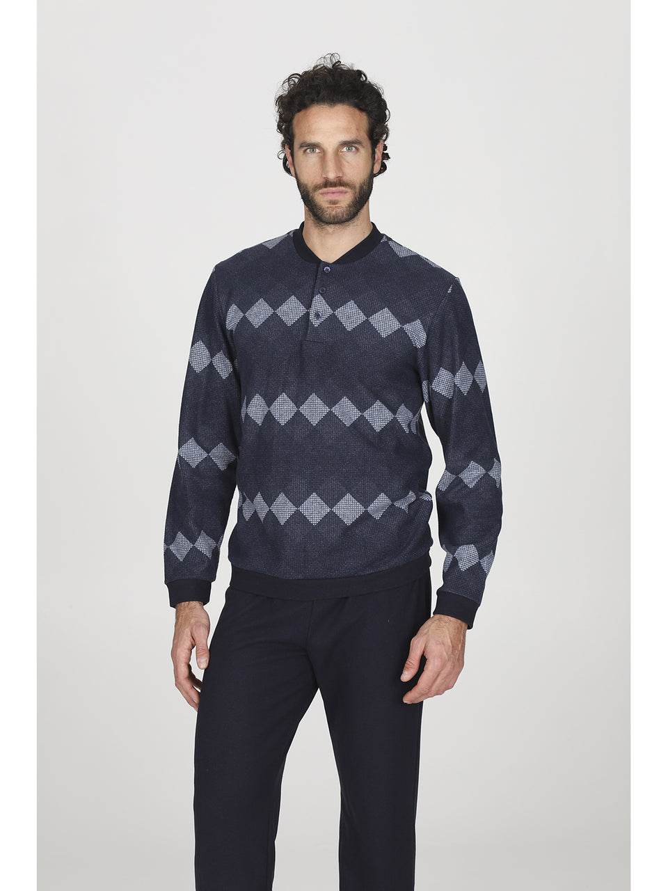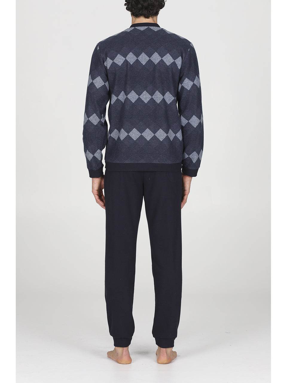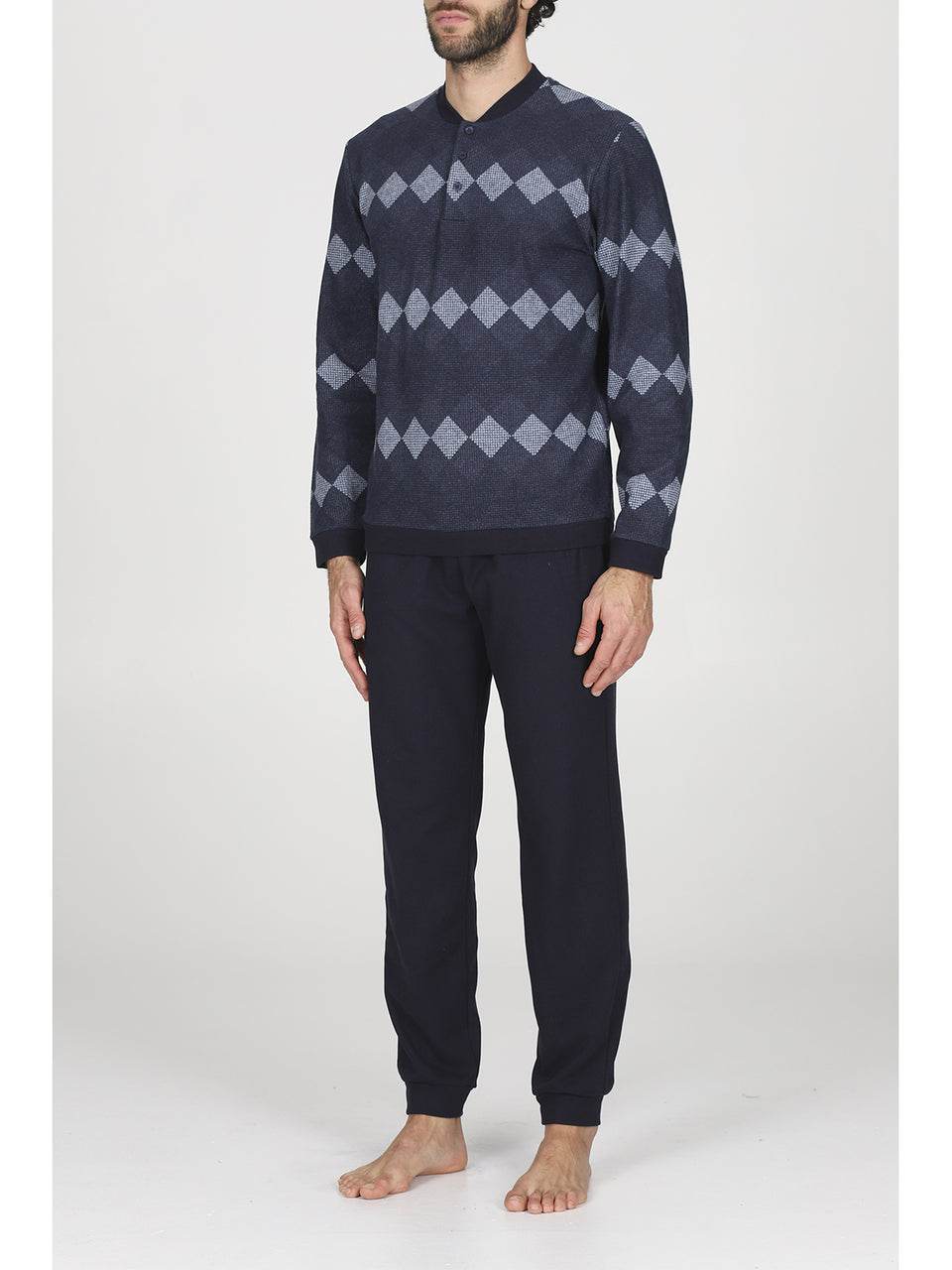 Il pigiama serafino in confortevole jacquard di cotone a rombi è l’alleato perfetto per l’uomo moderno che desidera unire stile e relax. La maglia, con colletto serafino e raffinato motivo a rombi bluette, garantisce una vestibilità avvolgente e una piacevole sensazione di comfort. La chiusura con bottoni rende l’indossarlo semplice e pratico, mentre i pantaloni coordinati a tinta unita, dotati di morbidi polsini, completano un look impeccabile.
