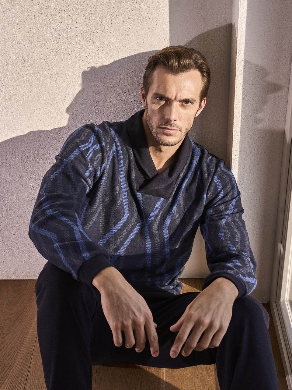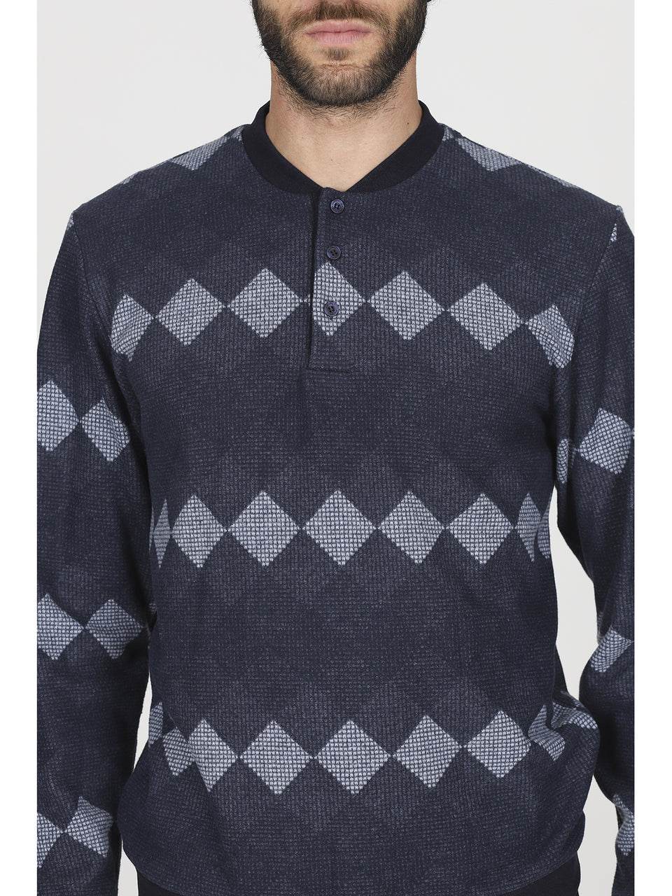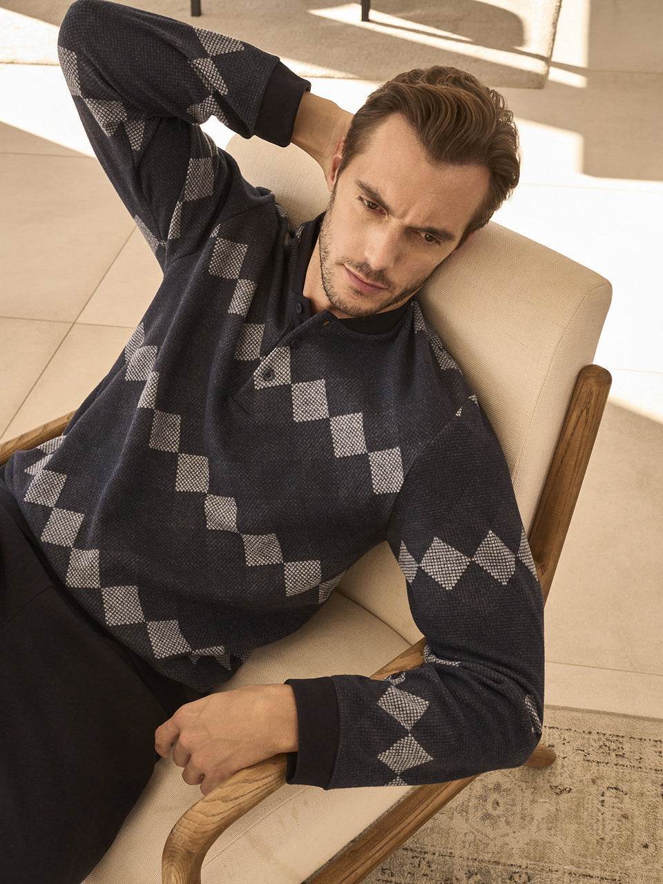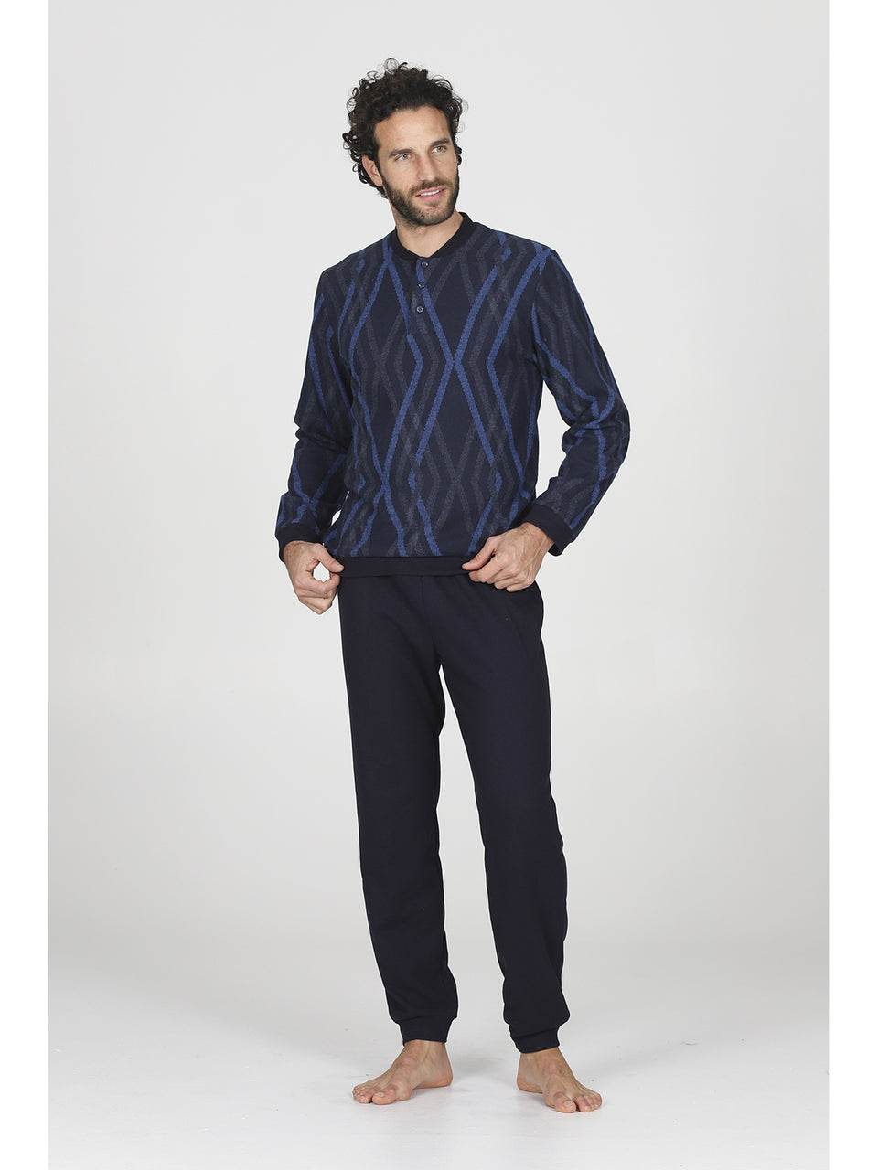 Il pigiama serafino in confortevole jacquard di cotone a rombi è l’alleato perfetto per l’uomo moderno che desidera unire stile e relax. La maglia, con colletto serafino e raffinato motivo a rombi bluette, garantisce una vestibilità avvolgente e una piacevole sensazione di comfort. La chiusura con bottoni rende l’indossarlo semplice e pratico, mentre i pantaloni coordinati a tinta unita, dotati di morbidi polsini, completano un look impeccabile.